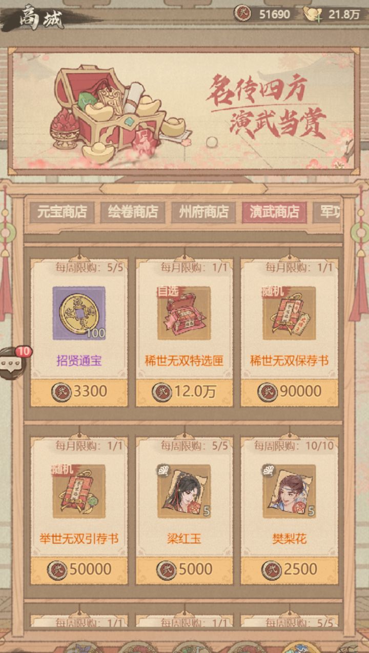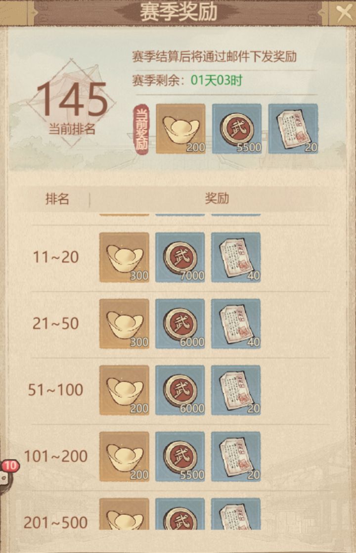在周一到周六期间,对于中低站力的玩家,可以把自己的防守阵容进行调整,比如换成 1 级僚属,或者只安排 2 - 3 个低星武将上场,将防守战力压低。这么做的目的是让自己的分数处于比较低的水平,从而让自己挑战时,可以匹配到武力值比较低的对手,能够将每日的演武币拿满。如果战力在区内排名靠前,不用调低战力,可以争取较高名次。