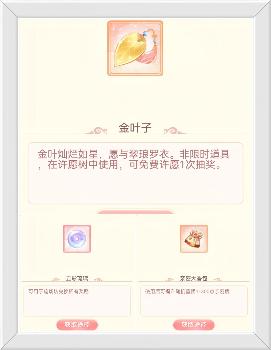 金叶子: 在许愿树中使用,可免费许愿1次抽奖。
