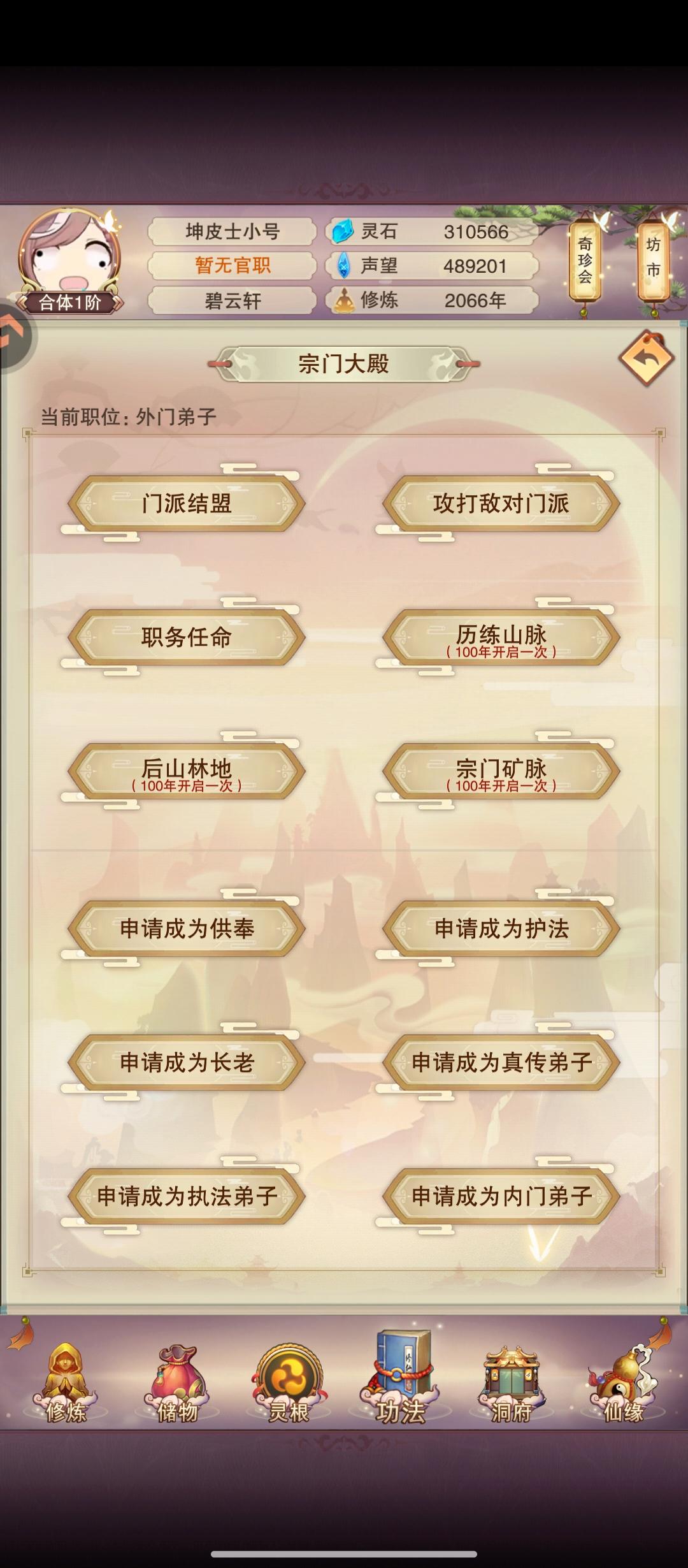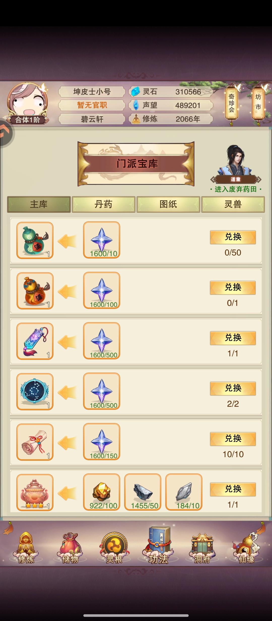 元婴期间除了12点和24点去坊市刷攻防闪,就是算好时间刷门派了。青羽门秘诀需要900贡献需要30个小时,第二天开始需要开始换红酒之后一直不断,一天100贡献两天就是200贡献,需要6~7小时,正好在第三天的时候可以换到青羽秘诀刷4星门派(别忘了用技能点优化攻防),刷到隐神或者九煞就可以进去了(推荐隐神,可以悟丹方,也可以早点炼丹),这次的贡献需要先升级职位到真传,然后再换秘诀(攒贡献换秘诀的同时去学炼丹炼器)。