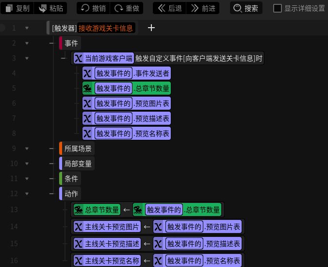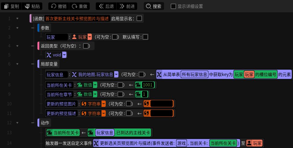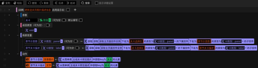 这样一来,游戏开始后客户端就会收到服务端发来的选关页关卡预览信息,并将其存入对应的简单表变量中。然后我们在客户端添加一个简单的更新选关页图片和描述信息的方法,定义一个名为“关卡”的数值变量参数,取到章节示意图和章节关卡描述的UI。当该方法被调用时就根据传入的参数,从前面的简单表变量中取到对应的信息将其赋值给UI,即可将关卡对应的预览图片和描述文字正确显示给玩家(P8)