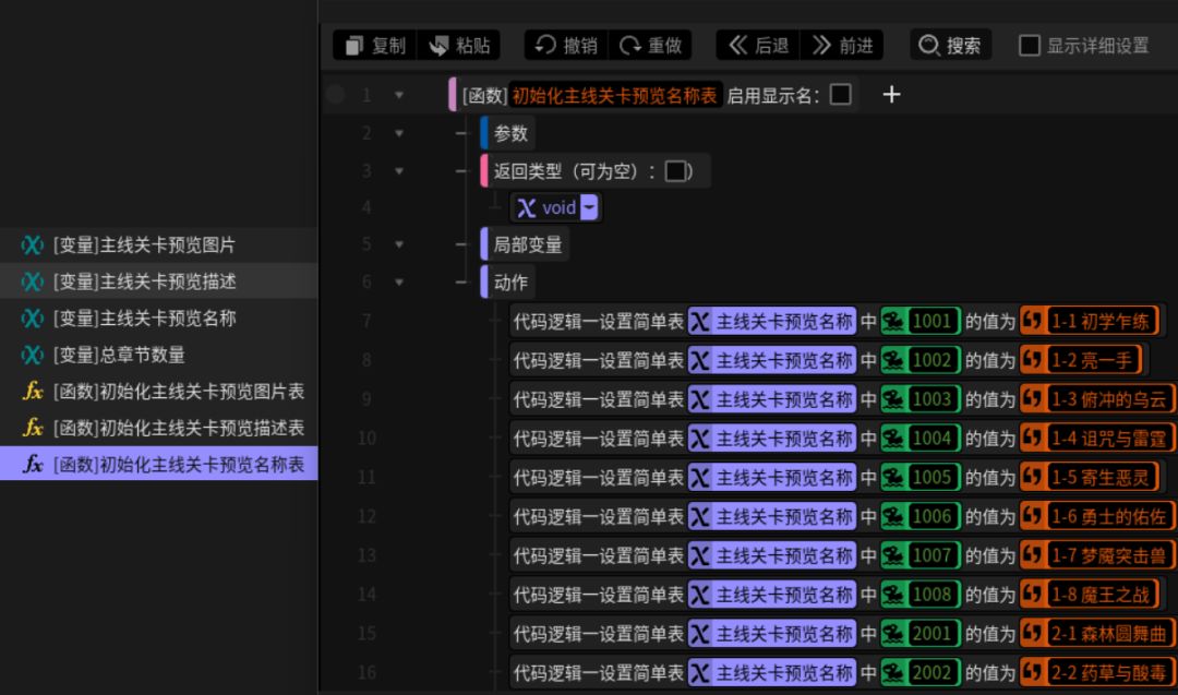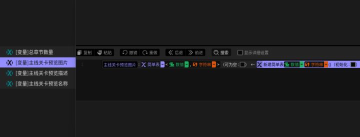 当玩家点击特定关卡按钮并将其选中时,要在右侧图片栏更新关卡对应图片,也需要在右下描述区更新相应描述显示给玩家。为了实现这一功能,我们在客户端先新建3个类型为简单表的变量,分别用于存储主线关卡预览的图片、描述和名称(P3)。它们的索引是关卡序号故为数值型,而值为字符串用于输入图片地址或文字内容。顺便建立一个总章节数量的数值变量用于存储主线关卡的章节数量。