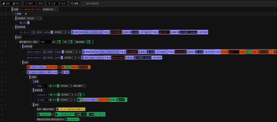 下面要为选关界面中的关卡按钮分别创建点击它们的事件。这里要依次取到选关界面中全部8个关卡按钮,用循环遍历会很方便。如果看过我之前笔记,会对取UI控件和创建控件点击事件的方法感到很熟悉。这里创建一个在循环内的数值型局部变量用于表示点击的关卡的索引,将该索引作为参数来执行刚刚创建的更新选关页图片描述信息的方法,即可让玩家在点击不同关卡按钮的时候实时将玩家点击关卡对应的预览图片和预览描述呈现给玩家(P10)