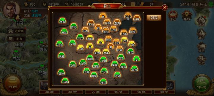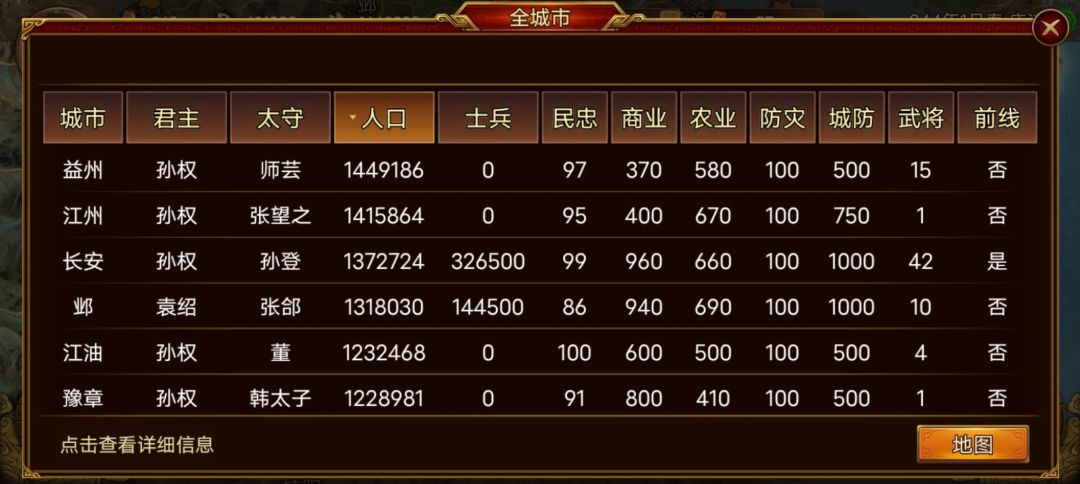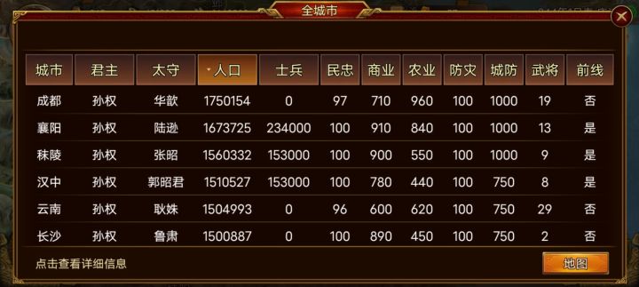玩的孙权,依旧休养生息增加人口,现在人口前十一全是我的城市,真心喜欢孙权,想让孙权统一,看三国志过来的,看三国演义的别喷