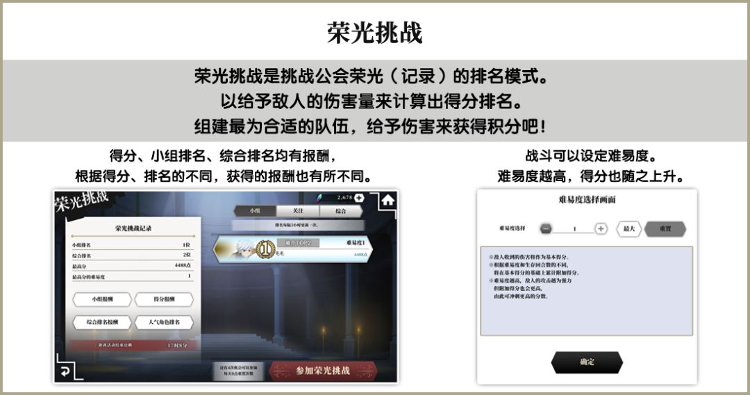 1、“荣光挑战”是根据给敌人造成的伤害量来计算得分、进行积分排名的活动!