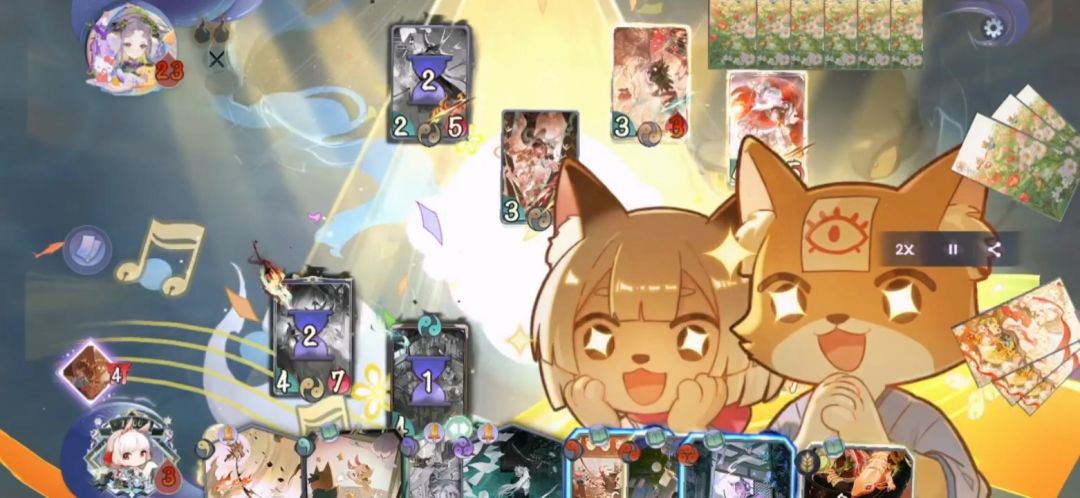 临时加班是求保底,「猫侍应归来」配合狐辞、蓝图愿景、服务升级,用来做4个蓝图,天胡情况,「猫侍应归来」直接打2火(「新生祭典」耐久达到11)。