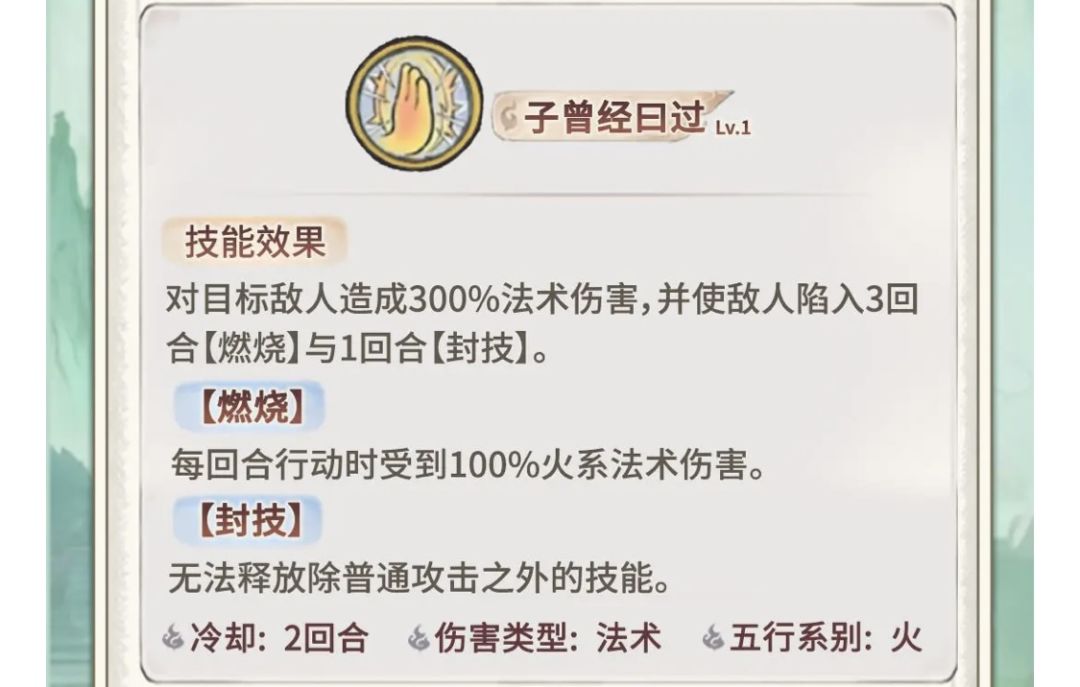 1.主动技能:[子曾经曰过]:高倍率面板300%法术伤害,3 回合燃烧(每回合 100%火系法伤),1 回合封技(禁放非普攻技能 ),2 回合冷却,输出➕挂buff➕控制,三合一多功能核心技能。