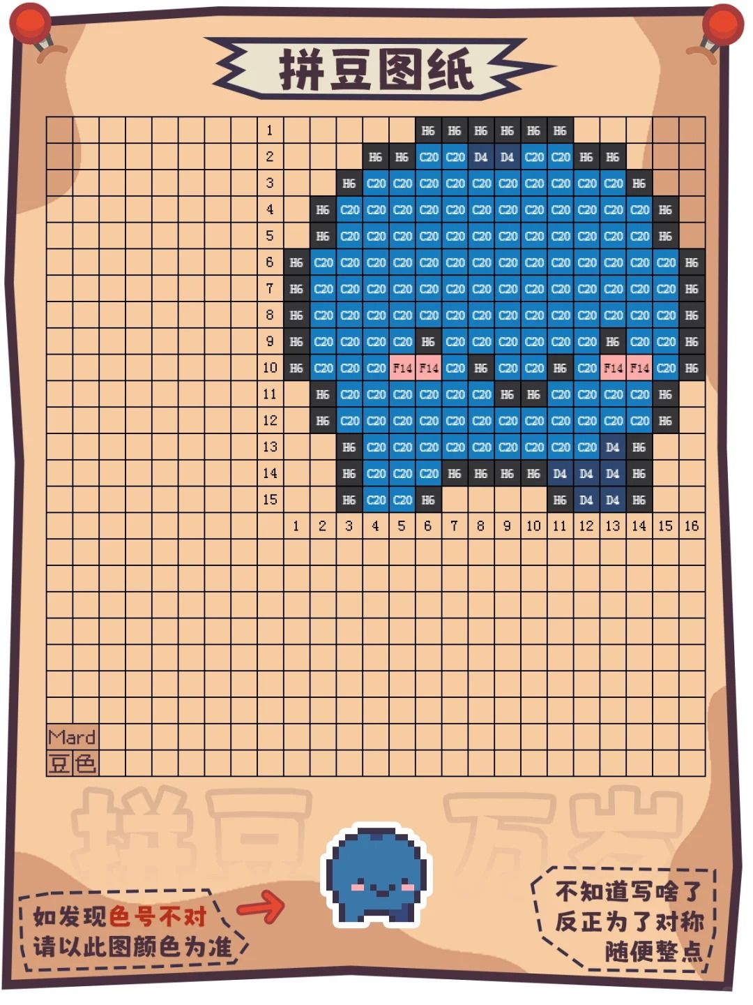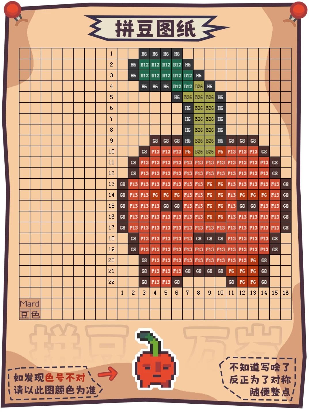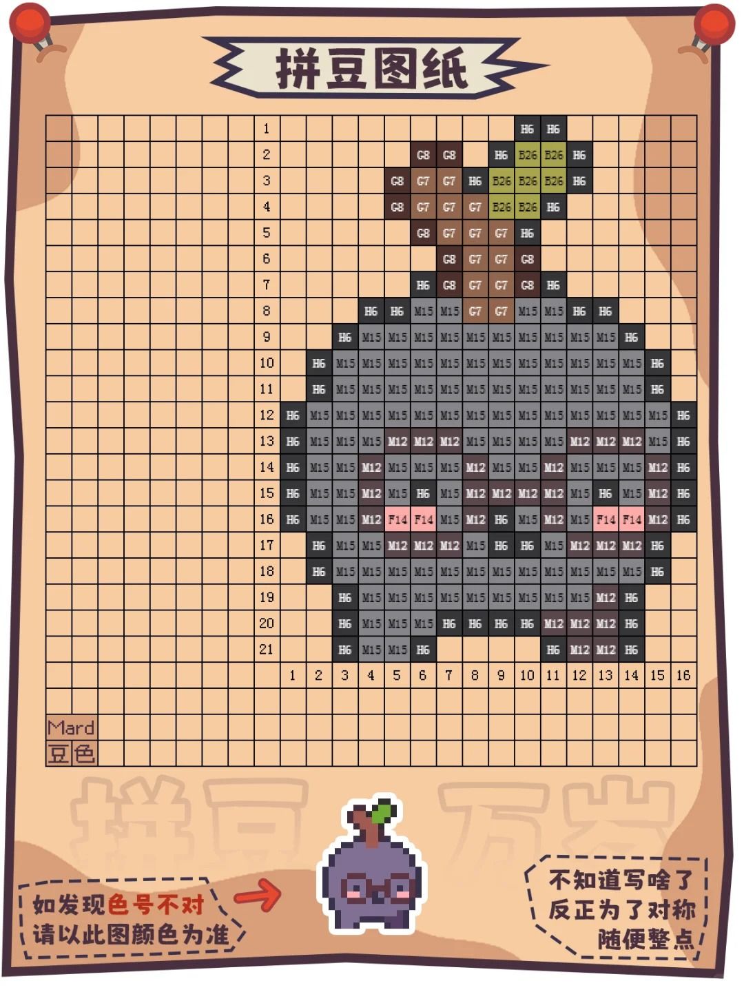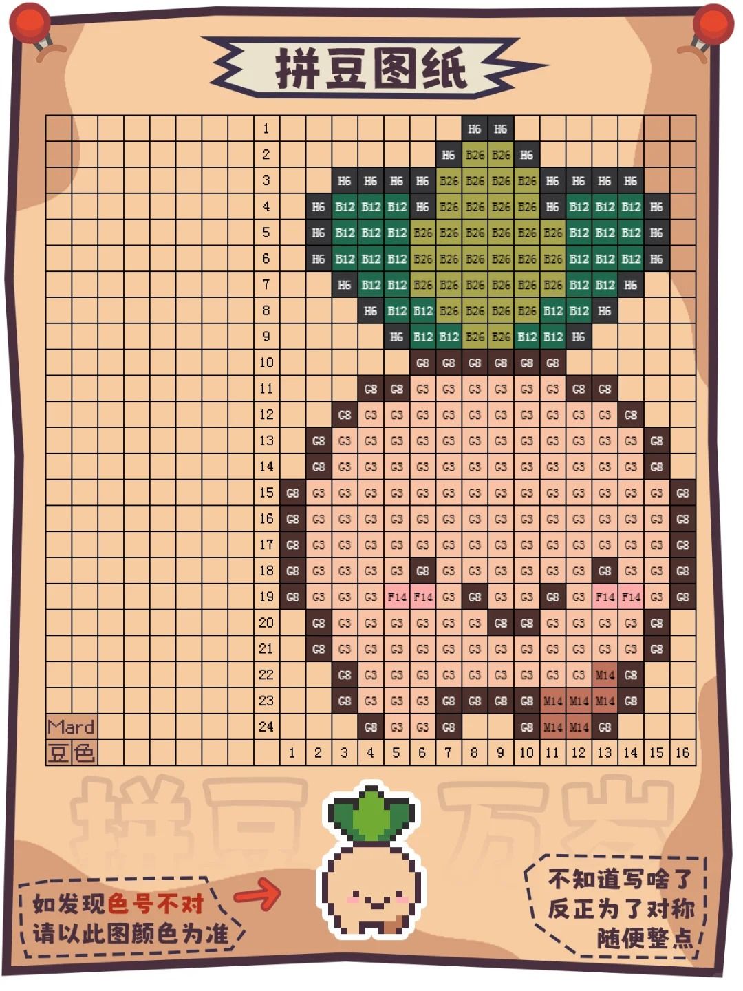 本次链接到的优秀市民用像素解决可爱难题,创作出《大头菜菜历险记》的拼豆图纸,本期分享共计六款角色。
