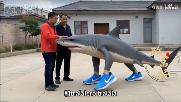 直到第一个AI山海经形象诞生也依然如此。2025年1月,一条穿着三只耐克鞋的鲨鱼图片作为第一只“神兽”出现时,紧跟着这个形象的就是一大段涉及到宗教侮辱的意大利语脏话输出。