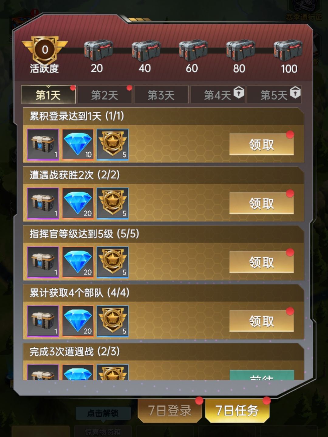 完成七日任务,赢取大量钻石、金币、超值活跃补给等奖励!用活跃补给合成强力载具,还有“高能”量子密钥,为指挥官解锁物质箱,领取海量超值资源!