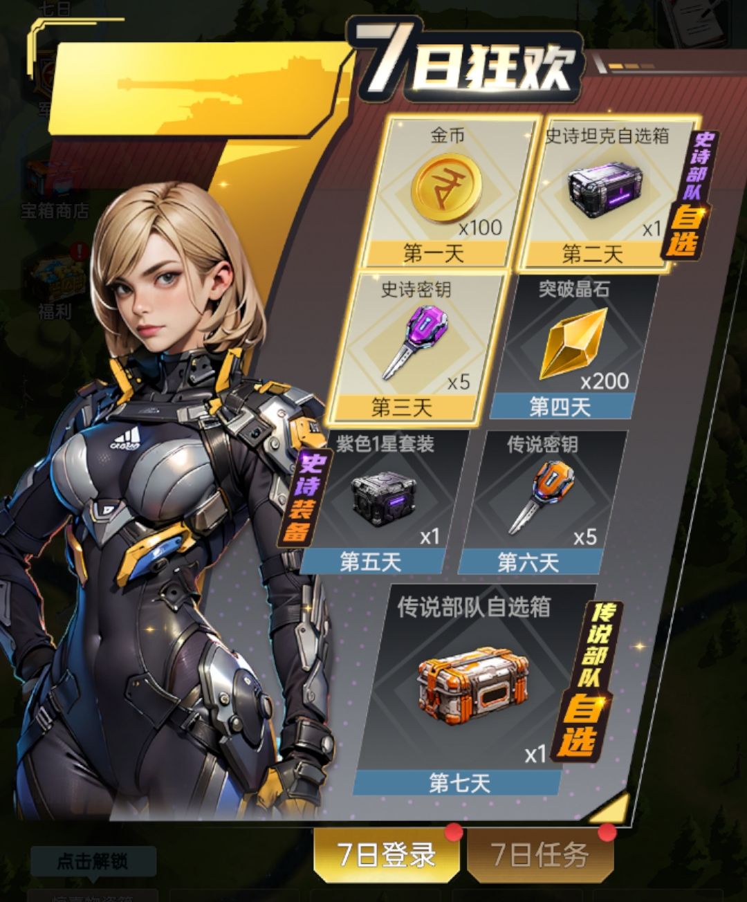 免费领取装备套装、突破金币、金币,登录第二天免费领取史诗坦克自选箱,登录第七天更能免费领取传说部队自选箱——多款强力装备,任你随心挑选。
