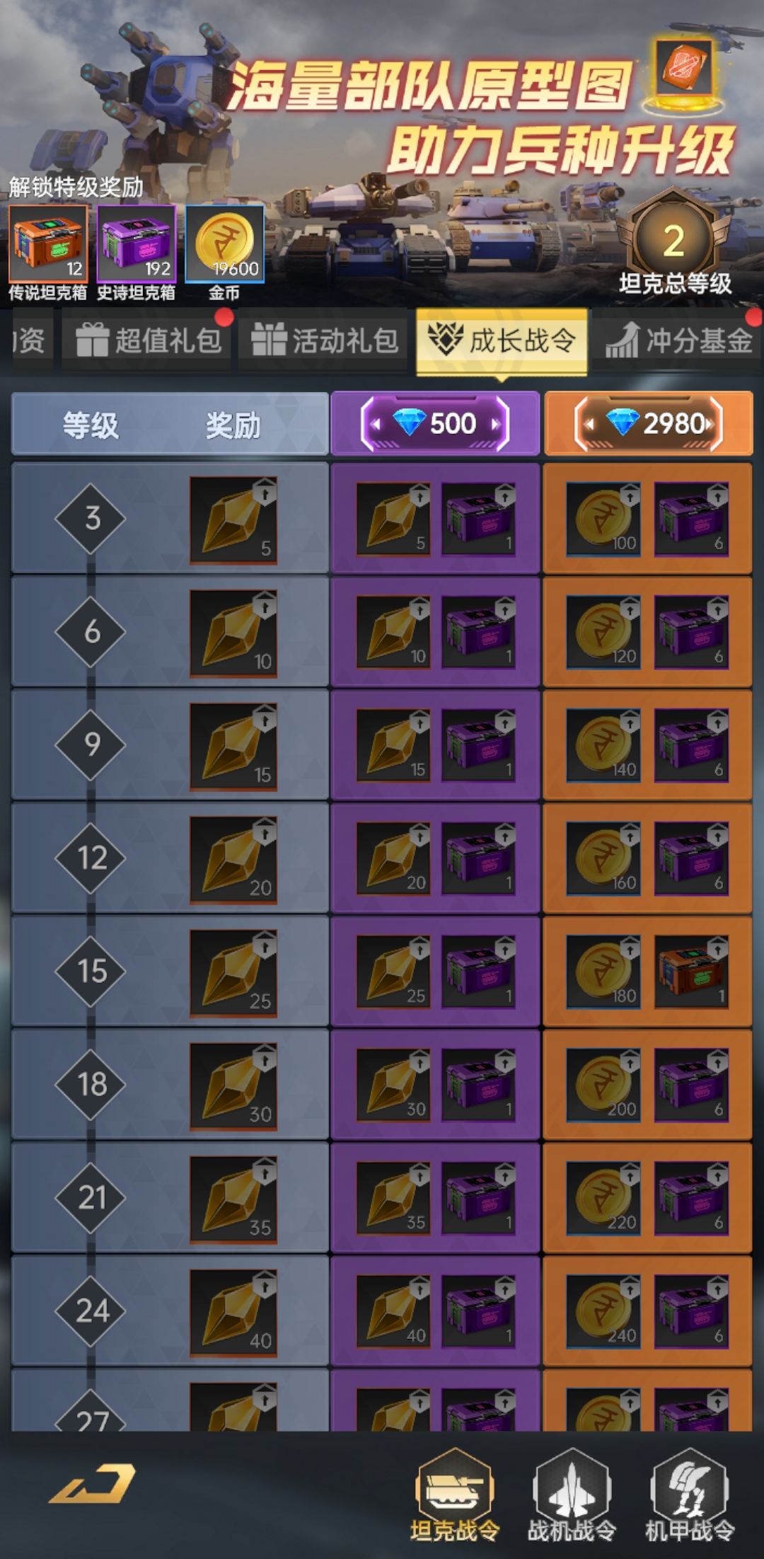 无需氪金!成长战令内含坦克、战机、机甲三大战令!层层升级,普通奖励即可获取珍稀突破晶石,晋升高级奖励更可豪夺大量突破晶石与史诗级载具箱,冲击特级奖励更能斩获海量金币与传说级载具箱!关键全程免费获取,仅需钻石即可轻松升级解锁所有丰厚奖励!