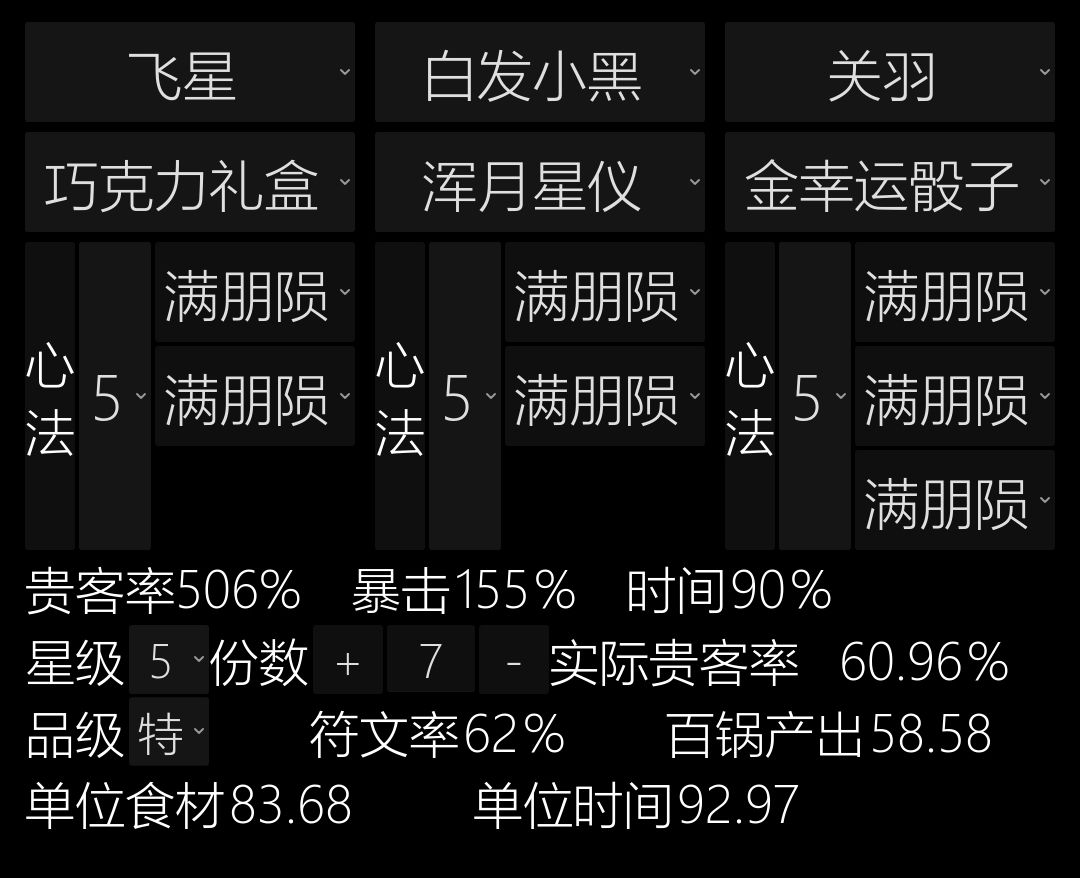 飞星+白发小黑+关羽,百锅产出是58.58;