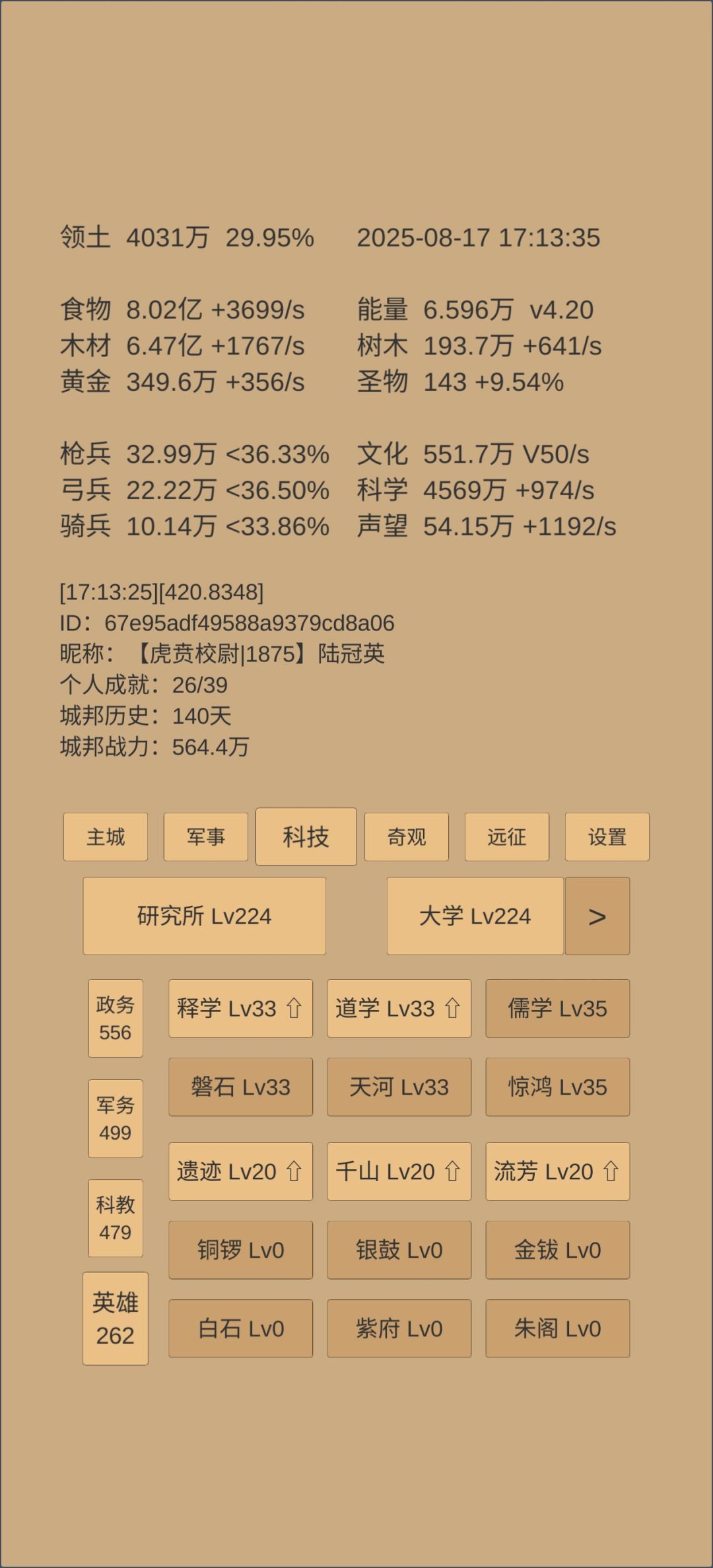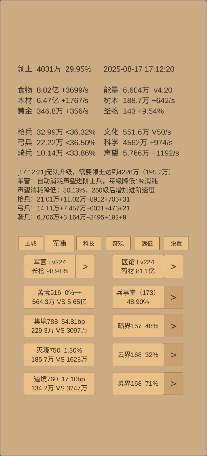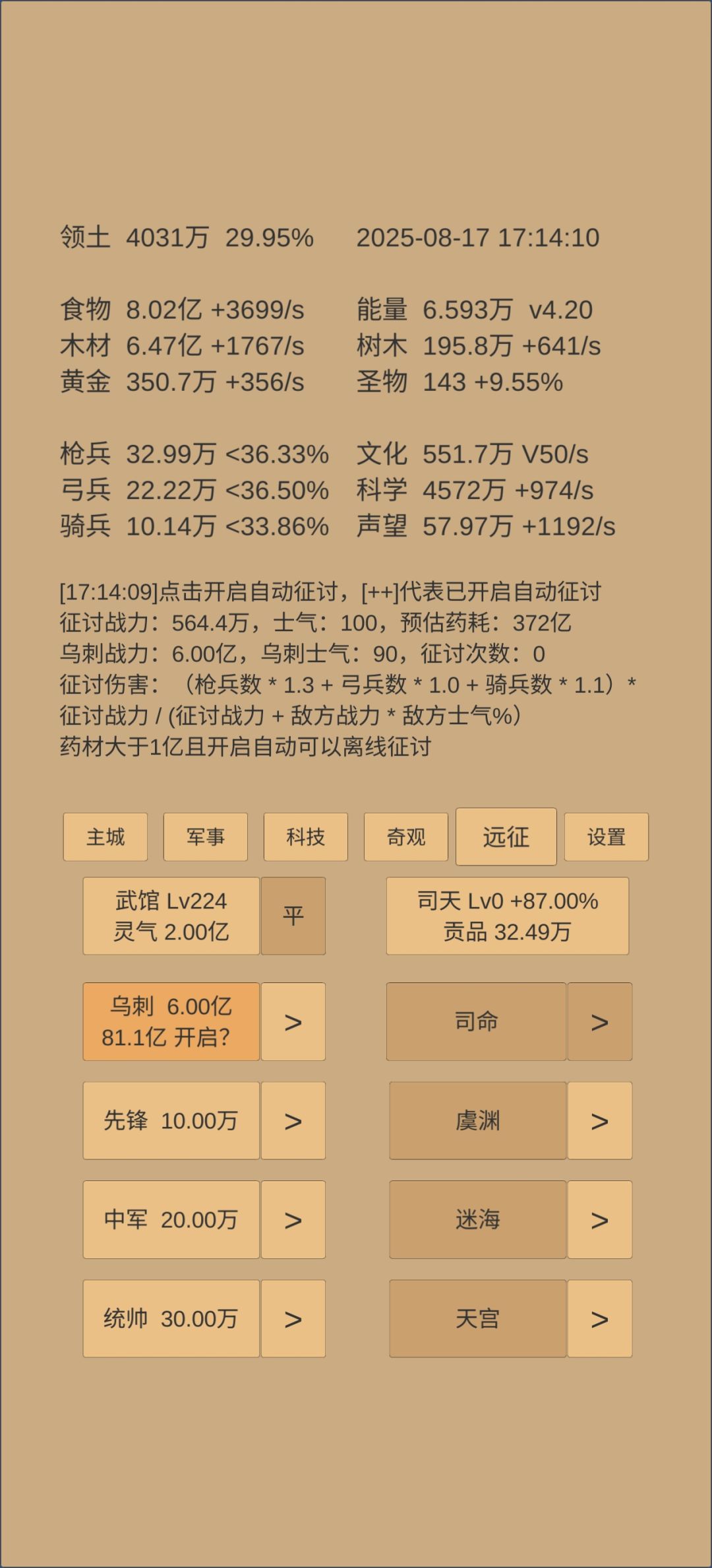 奇观升的差不多了,准备白云观8级应天府5级就开始推乌刺的三军。红尘今天能76,但丹还差很多,不知道转生前能吃多少,缺黄金聚灵才523。司天快一级了,估计和打三军差不多。感觉乌刺190天可能有难度。