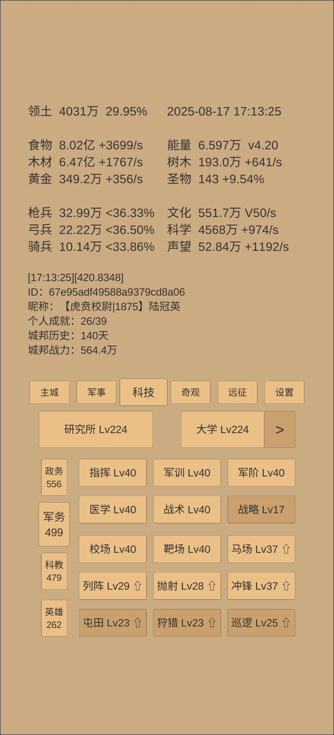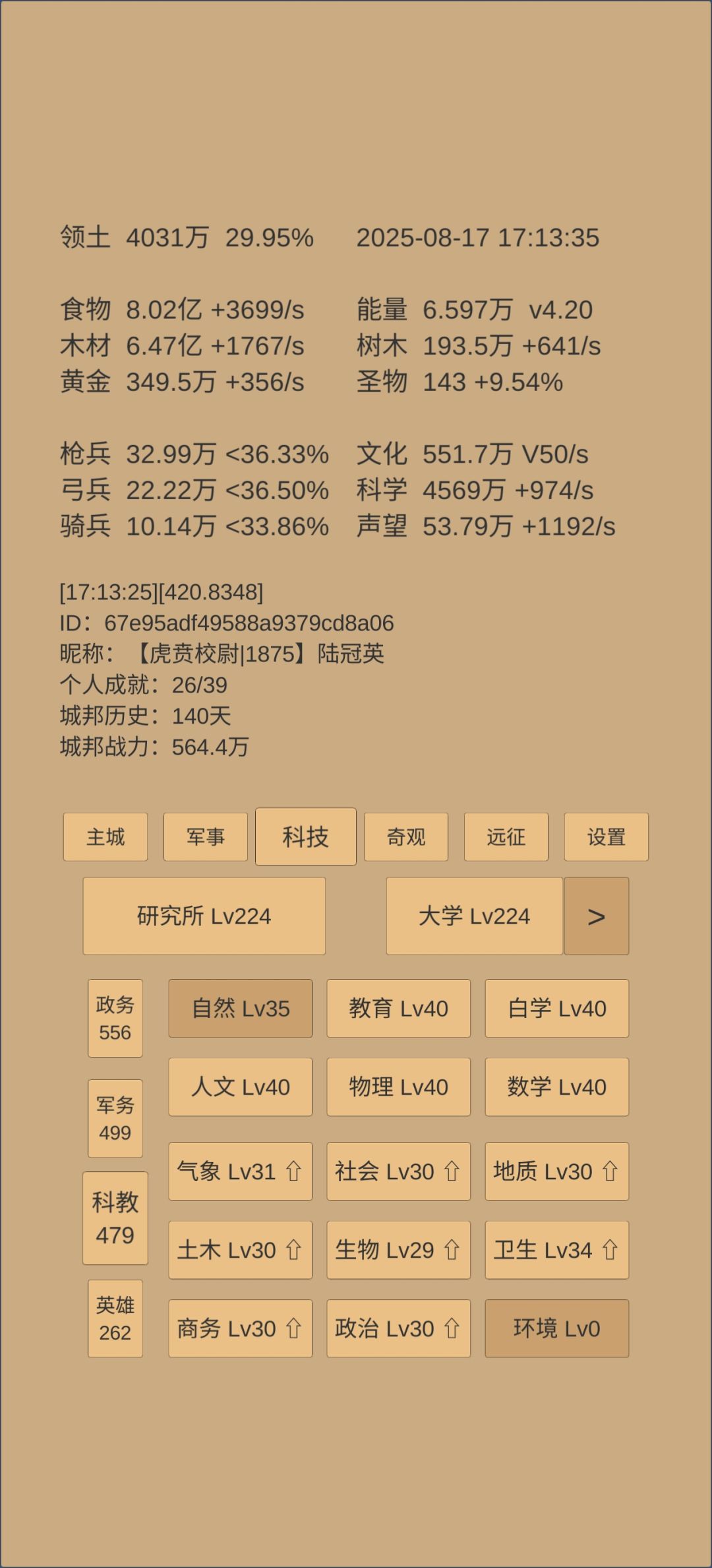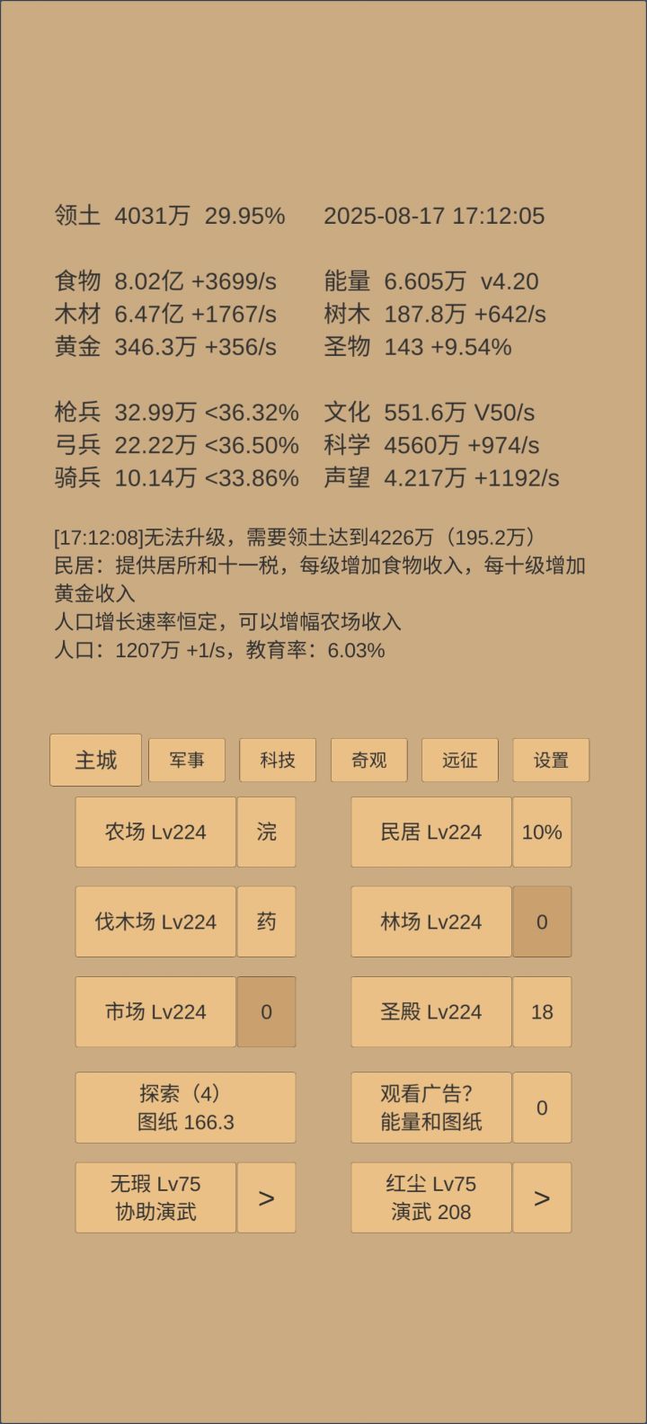 奇观升的差不多了,准备白云观8级应天府5级就开始推乌刺的三军。红尘今天能76,但丹还差很多,不知道转生前能吃多少,缺黄金聚灵才523。司天快一级了,估计和打三军差不多。感觉乌刺190天可能有难度。