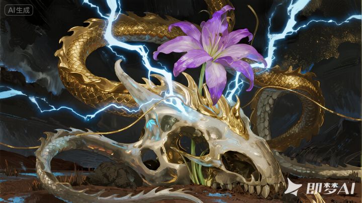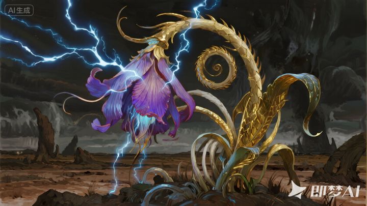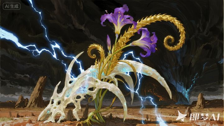 三尺金紫色螺旋草茎,叶如龙鳞倒插,叶脉涌动液态雷霆。茎顶悬三颗骨晶花瓣,花心迸溅蓝白电火花,空气中弥漫臭氧与血腥混合气息。