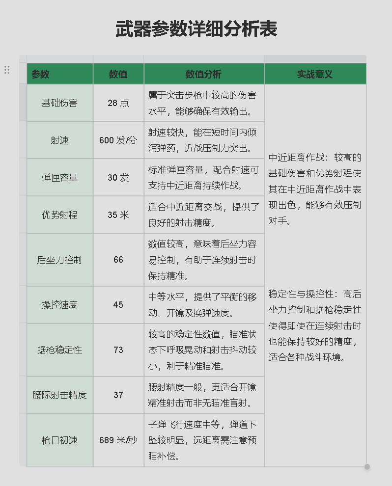 从数据种可以得出:AKM突击步枪是一把性能均衡的武器,特别适合中距离作战。它的高伤害和良好的后坐力控制使其在中近距离交战中非常有效。通过改装,可以进一步提升其适应不同战术环境的能力。虽然在远距离作战和近战中可能不是最佳选择,但在中距离,它是一把可靠的武器,适合多种战术需求,是团队作战中的重要火力支援。