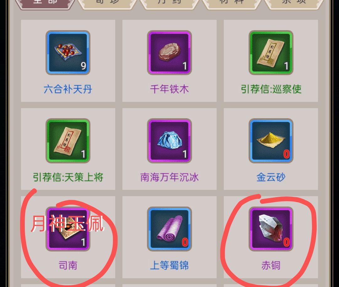 2楼月神门票 神兵材料(玄铁108 赤铜72 源晶36)
