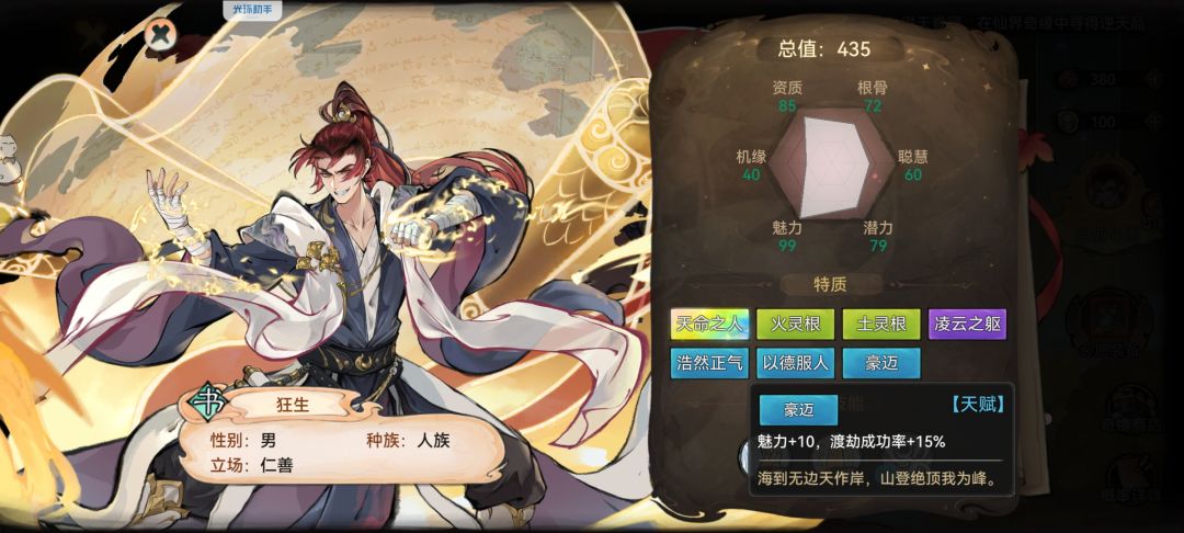 他的词条有豪迈:增加魅力和渡劫,浩然正气:增加效果抵抗,以理服人:增加法术伤害,和他自带的体质凌云之躯,增加效果命中和火系伤害提升。