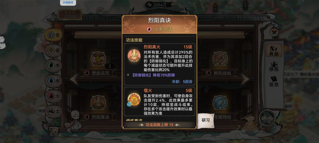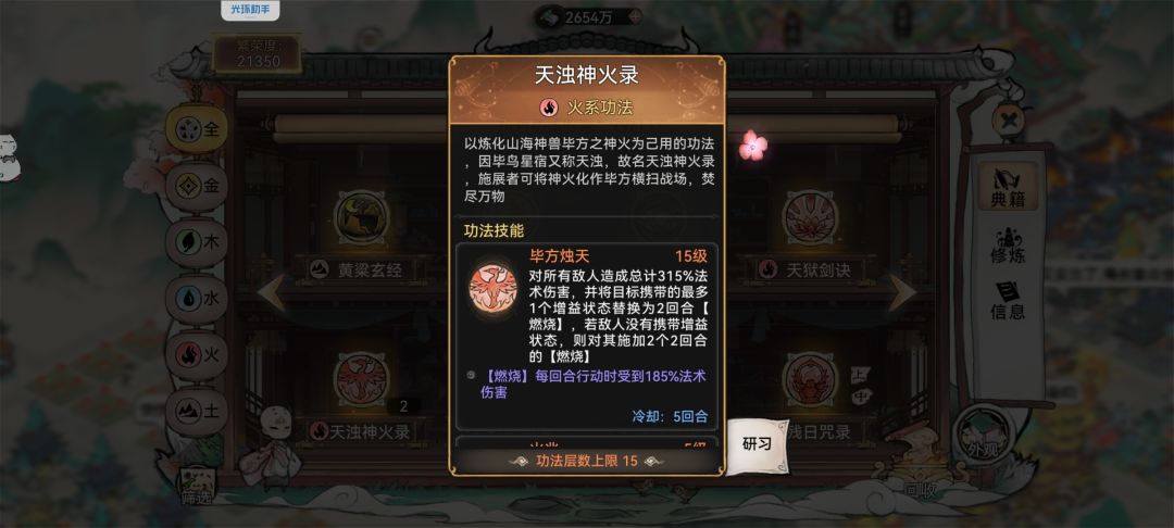 功法推荐天浊神火录和烈阳真诀,天浊神火录可以转换增益,尤其是遇到和尚的时候可以把和尚的无敌转换,烈阳真诀的伤害可以让狂生越后排秒人,大幅提升自己的火系伤害。
