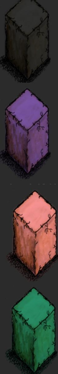 黑色绿色紫色棕色土坯墙,绿色油漆制作黄色颜料放入油漆桶再放入蓝色颜料,白色油漆加朱砂以及藏青色颜料=紫色油漆,棕色油漆需要白色油漆桶加一碗木炭粉末,黑色油漆制作更改为棕色油漆加一碗木炭粉末盐水孔雀石粉煮沸状态可以用夹子夹下来=藏青色染料