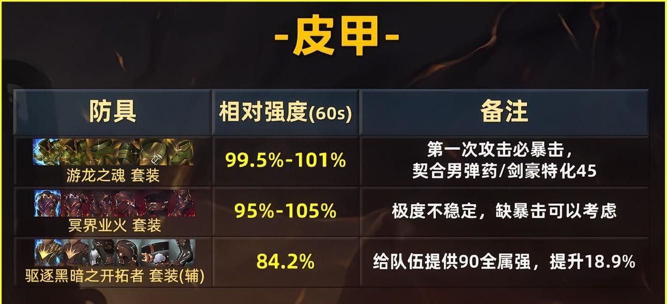 皮甲职业游龙套和业火套相差不大,业火套虽然上限更高但不稳定,综合下来两套强度差不多。游龙套更适合平民玩家。