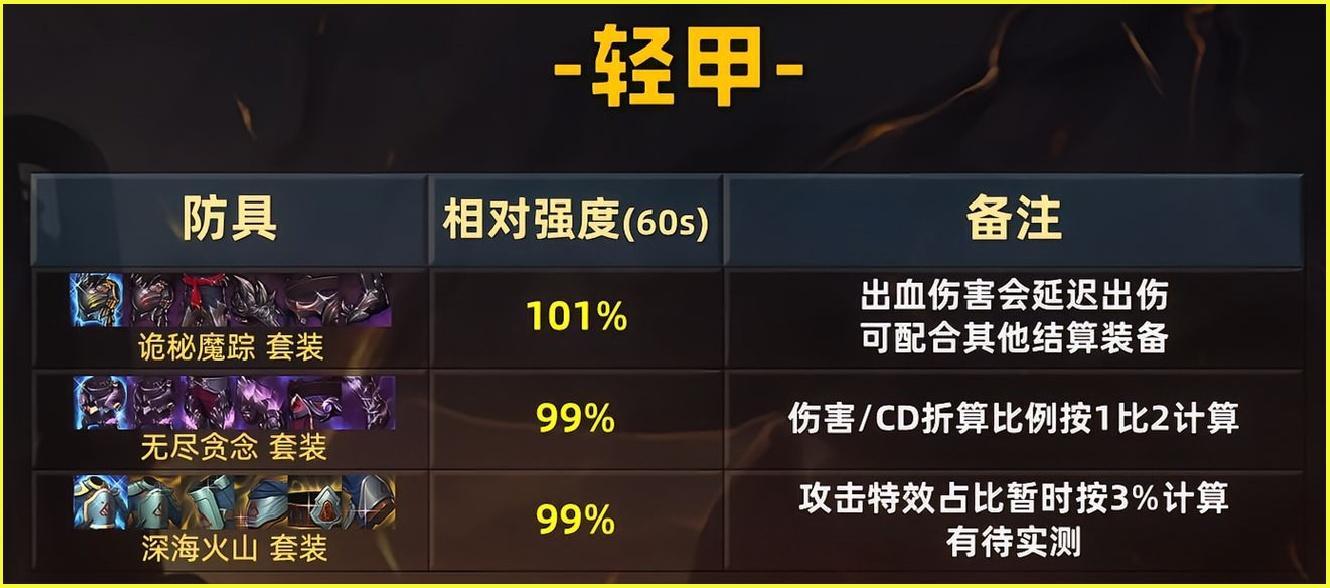 轻甲职业魔宗套最强,但出血伤害结算有延迟,实战中不好抢其他怪物伤害。无尽贪念MP套装强度和深海火山相近,算是比较稳定的选择。