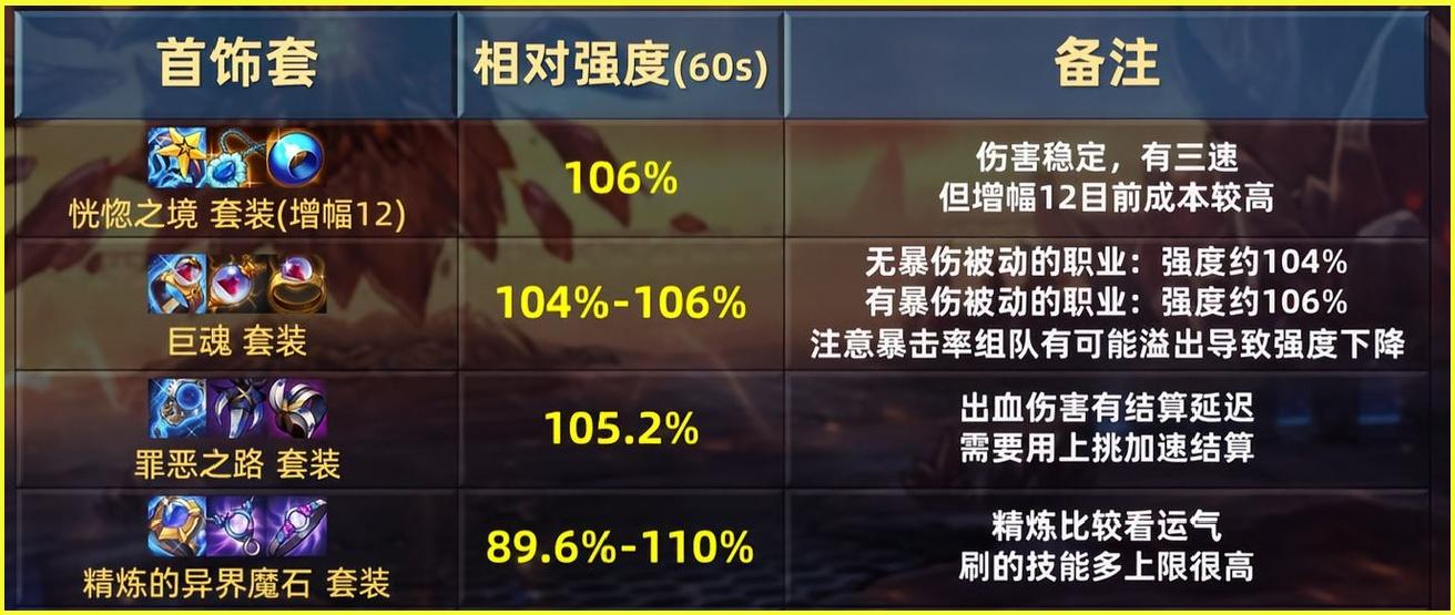 大部分人毕业的还是巨魂套首饰,高暴击基础属性收益大。罪恶之路首饰强度提升也大,但出血伤害有延迟需要用上挑加速结算。精炼的异界石套装毫无疑问是伤害最高的,缺点依然是随机刷新技能不稳定,下限太低属于欧皇专属了。
