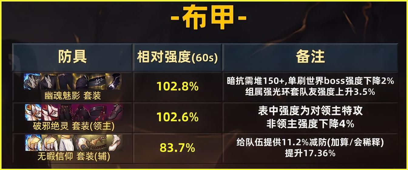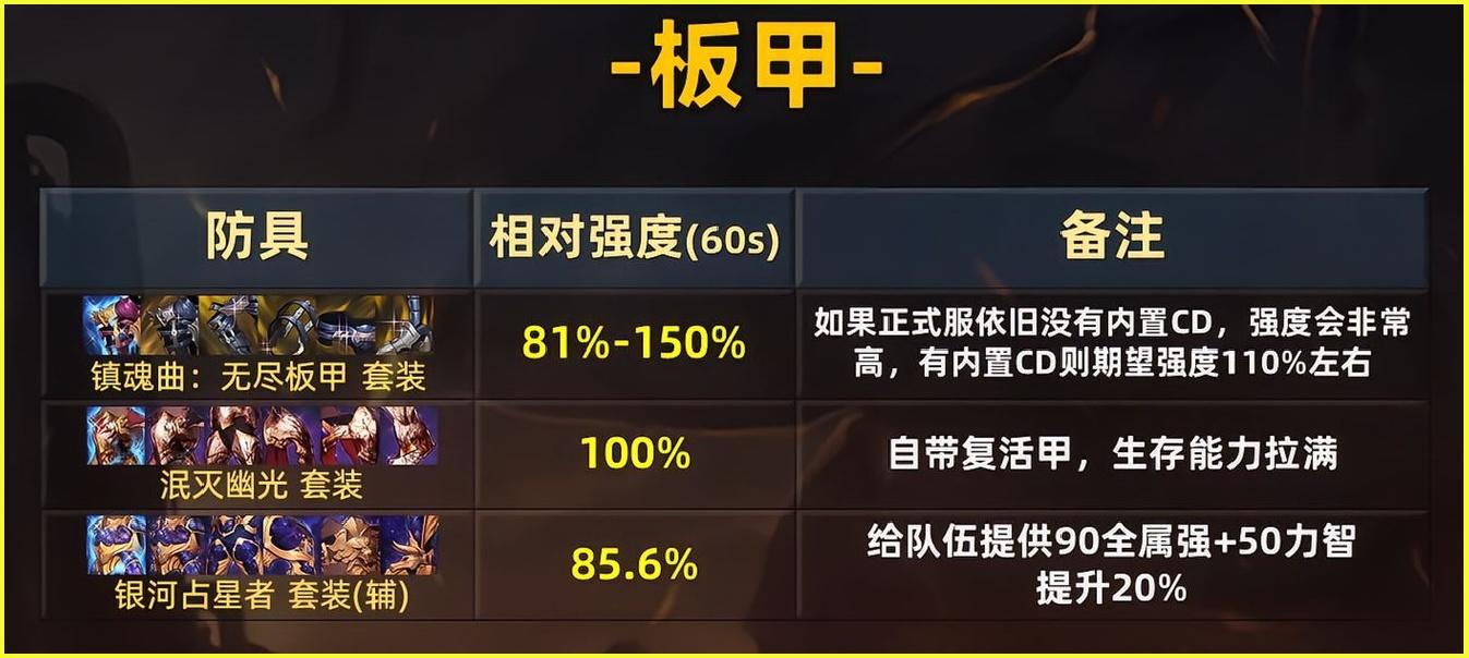 板甲职业镇魂上限突破天际,是打世界BOSS冲榜最强装备。体验服无内置CD,正式服等待测试。缺点也有,脸太黑的玩家下限也低!幽光套倒是比较稳定,但珠玉在前你们懂的。