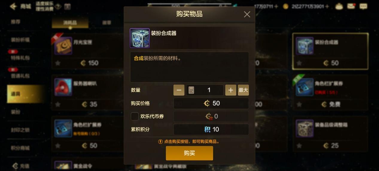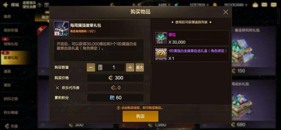 比如我们可以购买1次“每周属强徽章礼包”+4个“装扮合成器”;