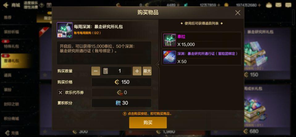“整数周礼包”在这里特指“每周深渊:暴走研究所礼包”和“每周属强徽章礼包”这两种。