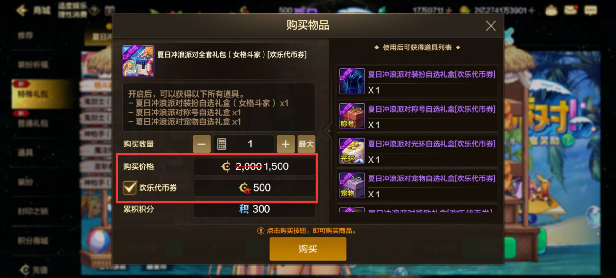 以上仅展示夏日礼包,在选择任何商城道具时,一定要记得勾选使用欢乐代币券选项,这样才算点券“抵扣”。