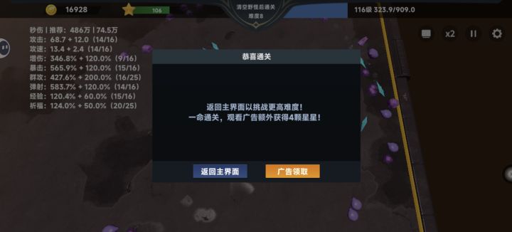 群攻和弹射可以1:1升级,个人凭直觉点升级,加上运气好。经验和祈福可以看情况拿,最好升一会拿几次,少也要拿,一些升级哪怕一级也可能比高级的效果好得多(1大于3说是)缺啥补啥。有时候秒伤高于推荐但还是会被贴脸,这个没办法,所以说看情况凭感觉去选可能是最好,攻速比较玄学,情况不对可以尝试靠攻速强化输出。