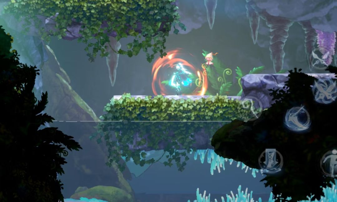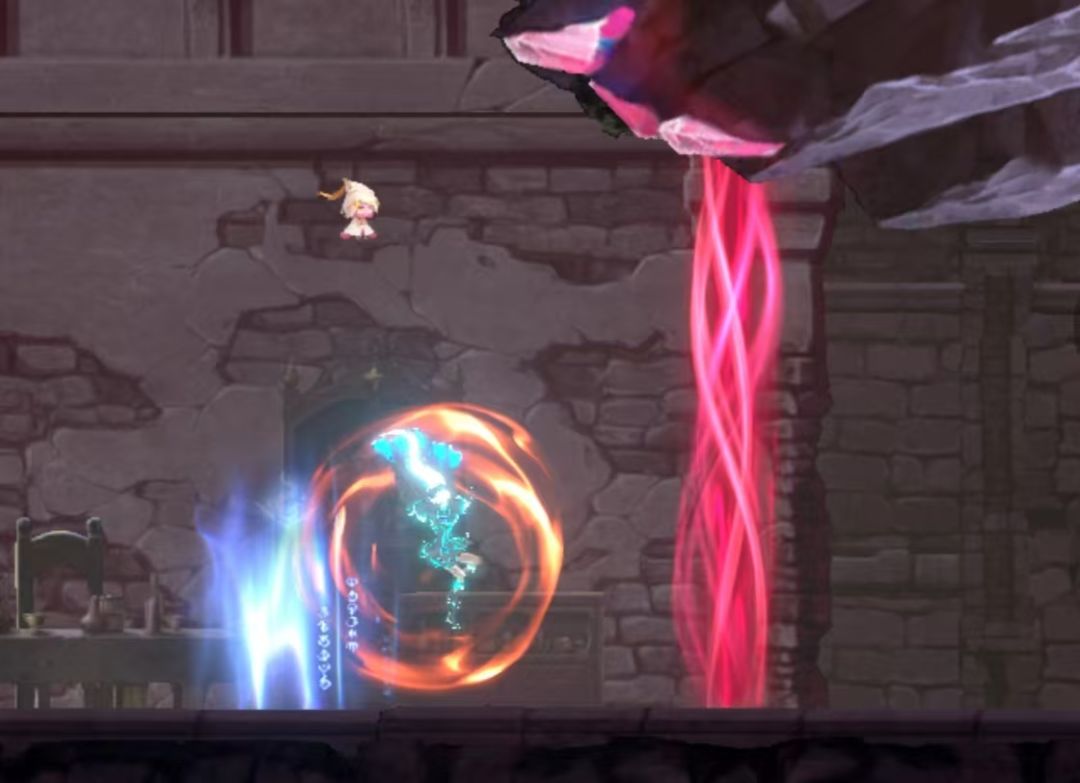 下踢/火焰下踢,需要在空中才能释放,踢中图中飞行怪后,会重置跳跃次数,然后跳到第二个飞行怪的上方,下踢第二个飞行怪,又重置跳跃次数,像台阶一样,一步步的就跳上去了