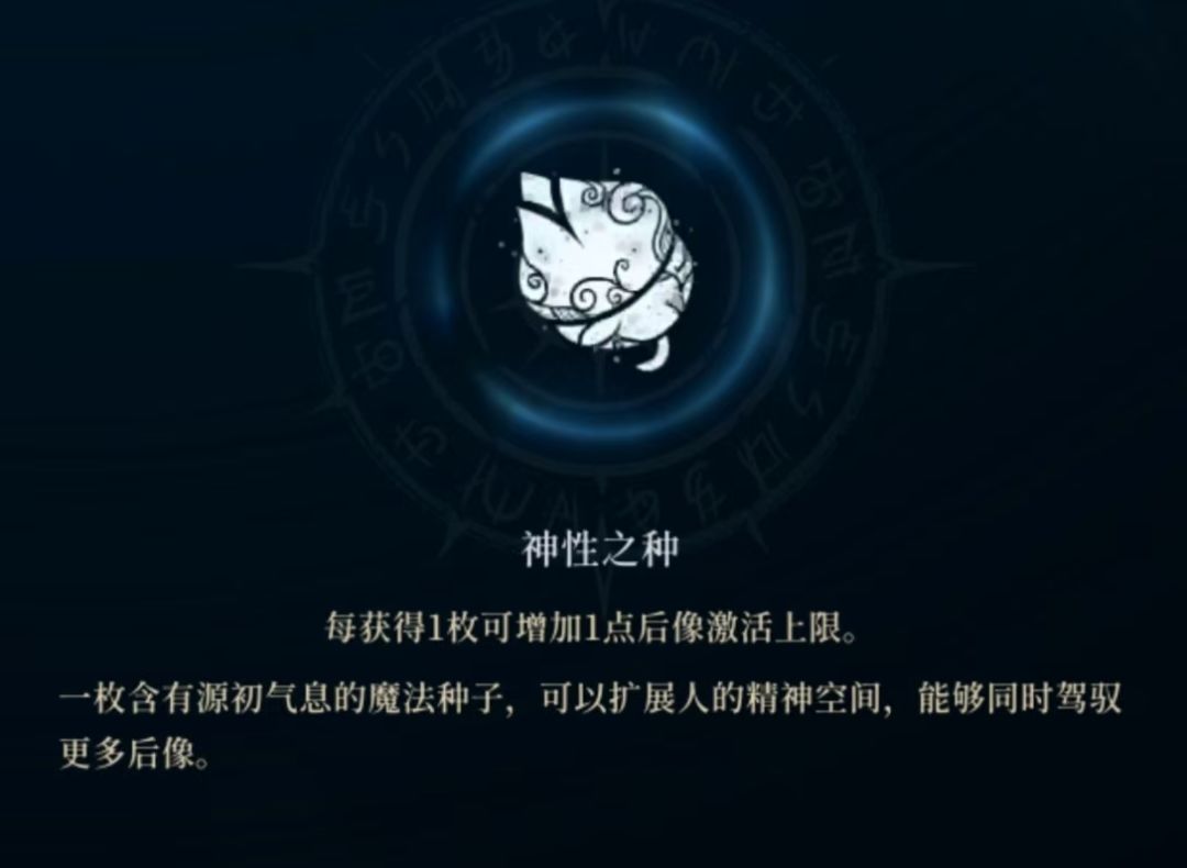 激活“后像”需要拥有神性之种,每拥有一颗神性之种可激活一个后像,神性之种初始自带一个,游戏一共6个神性之种,这个和饰品的神性之环有点类似,除了初始自带一个,一共还可获得5个神性之种