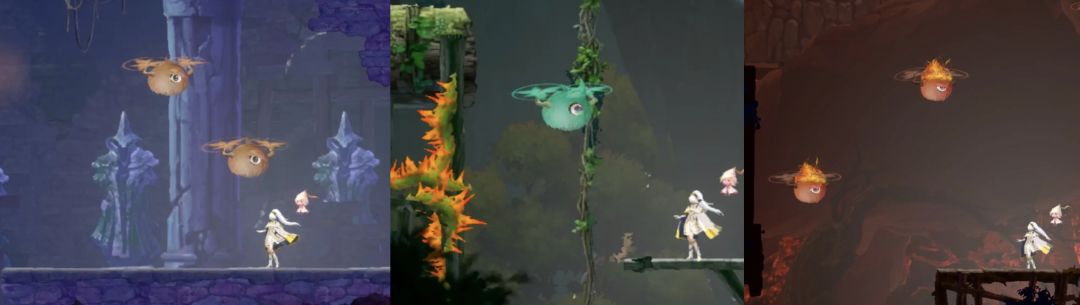 这其实是2种飞行怪,一种是红色飞行怪(头上顶一团火),一种是其他颜色的飞行怪(头上没有顶火)需要用到2个“能力”,下踢和火焰下踢,火焰下踢是普通下踢的强化版,普通下踢可以踢头上没有火的飞行怪,头上有火的飞行怪要使用强化之后的火焰下踢,