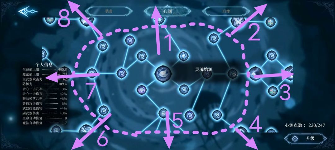 你也可以把这个理解为技能加点,心渊点数即技能点,全技能点满共需230点,游戏全收集完之后技能点数还有多的,可以放心大胆点。左下角为你的角色属性面板。