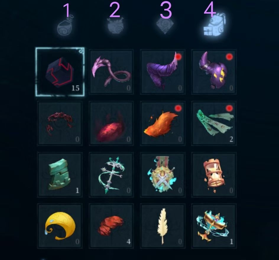 1号位为药水、烹饪食物,1号位的物品背包数量是有上限的,举个例子,一共有12瓶红药,但是背包里的红药上限是5,一次只能随身携带5瓶红药,剩下的7瓶红药会存在云仓库,背包内的红药数量会显示5(7),在存档点休息保存之前,你能用的只有5瓶,存档点休息保存之后,会自动用云仓库里的库存补齐消耗至数量上限,我现在的数量是5(7),之后用了3瓶,数量变成2(7),存档点休息保存之后,数量会变成5(4)