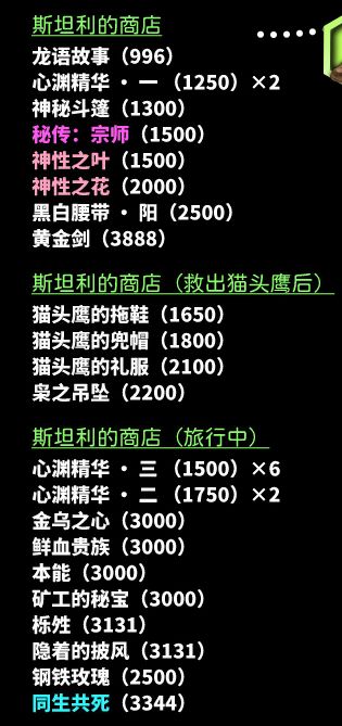 章节中间有个古董商人“斯坦利”,商店卖好东西哦,完成相关任务之后会刷新新的货物,核心道具“龙语故事”“同生共死”(拿了“龙语故事”记得回宁静水脉补一下NPC“瑟”):