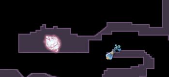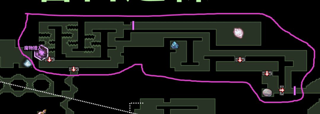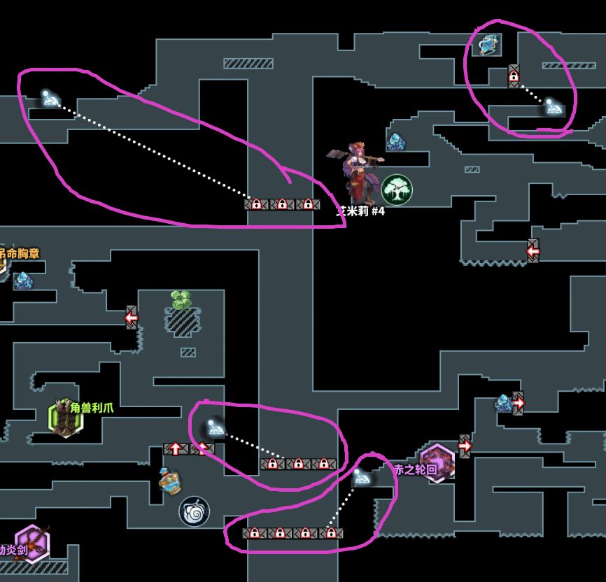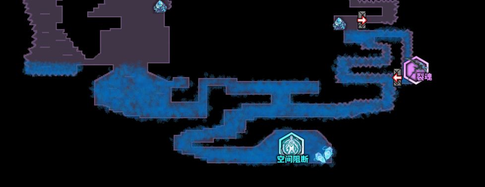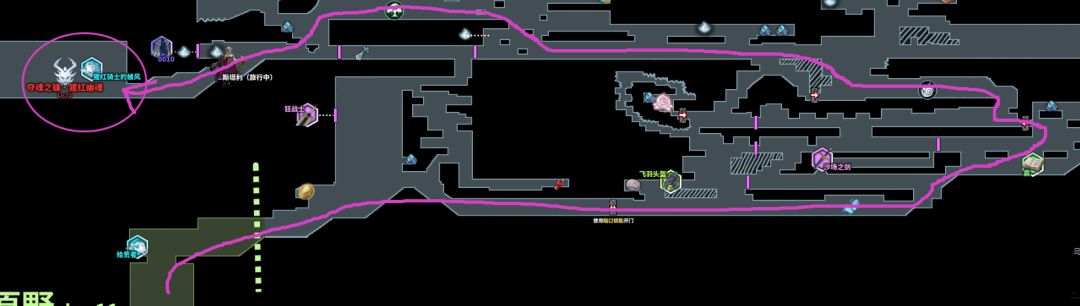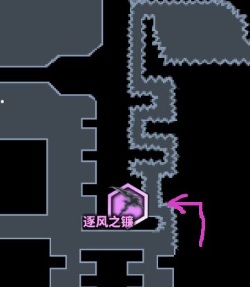 这里是红光墙,暂时过不去的,前面提到过的:“猩红骑士的披风”,俗称红冲,“巨人的陨落”获取,可以强化冲刺,通过红光墙:(在之后的地图中发现类似紫色竖线的地方都是有红光墙,稍微留意一下):