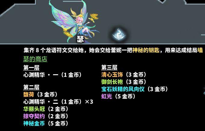 宁静水脉最核心的就是NPC“瑟”,取得放逐小镇古董商人“斯坦利”商店里的“龙语故事”,才能触发对话,收集“瑟的金币”,来这里买东西,清空物品之后会刷新新的贩卖物品,其中的核心道具“神秘金币”、“宝石妖精的风向仪”、和双剑的顶级毕业装备之一的“虹光”: