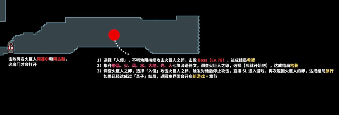 探索完之后,注意下火之领域的右下角,这一块先不要进去,我们到这里还差一个道具,这是进入结局环节之一: