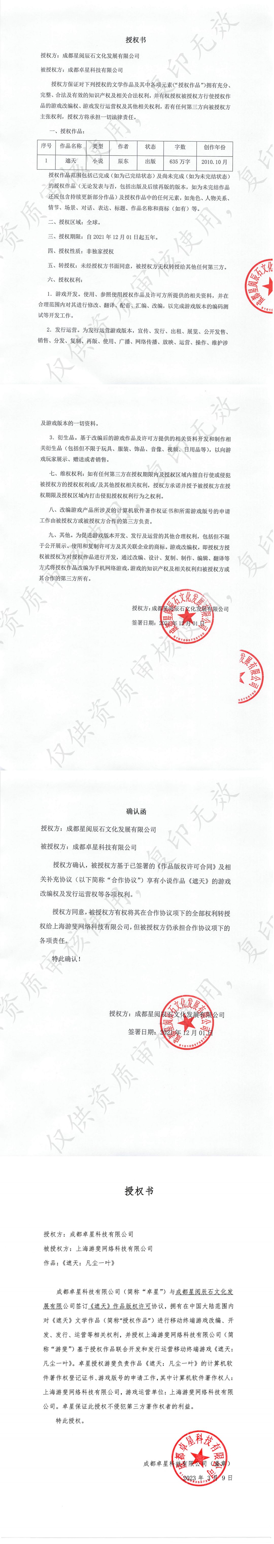 1. 我司于2021年与《遮天》IP版权方达成正式合作,依法获得该 IP 的正版授权,并基于此开发制作了产品《遮天:凡尘一叶》,相关授权文件真实有效。