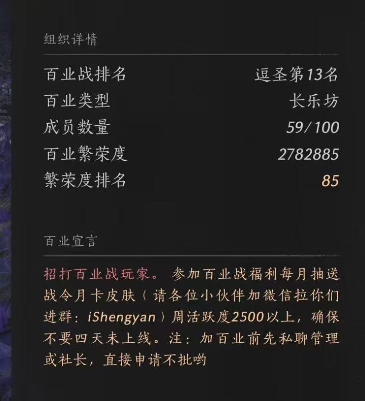 喜欢玩燕云的少侠们,欢迎来“半白”百业,百业就是公会帮会性质的东西,来了大家可以一起打本做活动,每天晚上还有泡澡活动可以领取经验。周末还有百业战,欢迎各位少侠。要求就是每周2500活跃度(很简单),然后加微信群就行(欢迎话唠)社长微信iShengyan 加微信备注一下哟