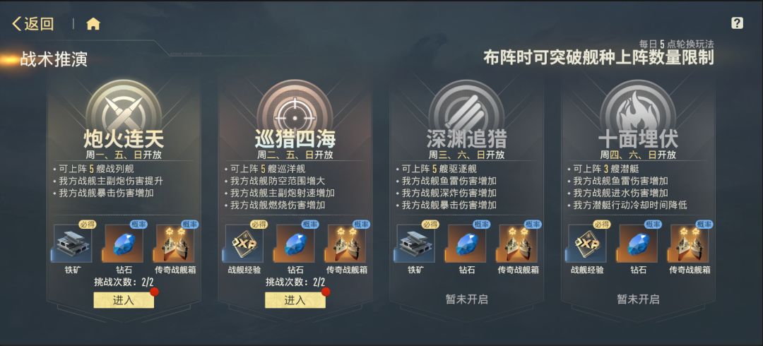 战术推演包含四种主题关卡,对应不同舰种挑战,开放时间与奖励各异: