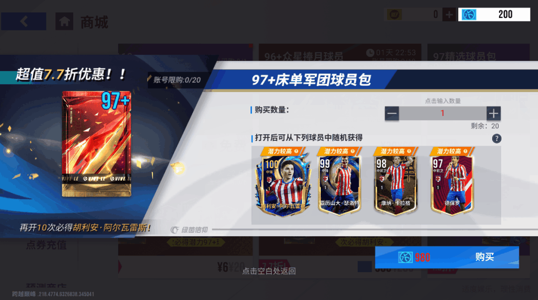 【97+床单军团球员包】阵容召集挑战将于8月18日11时-8月25日11时开启,账号限购20次,打开后可获得97-100巅峰或精选球员,仅需980蓝券,开启10次必出【100巅峰阿尔瓦雷斯】!