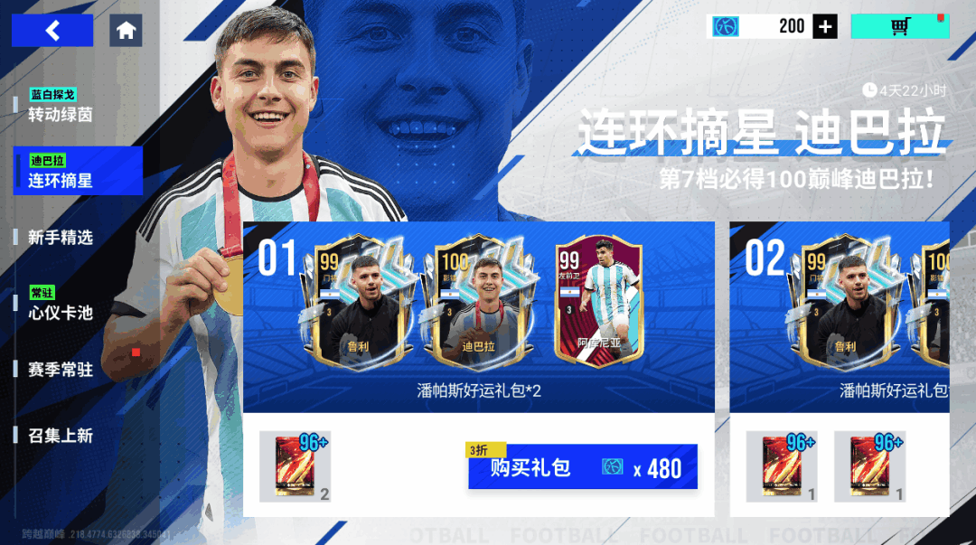 【连环摘星】8月18日11时-8月25日11时期间,通过参与活动购买连锁礼包,有机会获取100潜力值巅峰迪巴拉、99潜力巅峰鲁利!