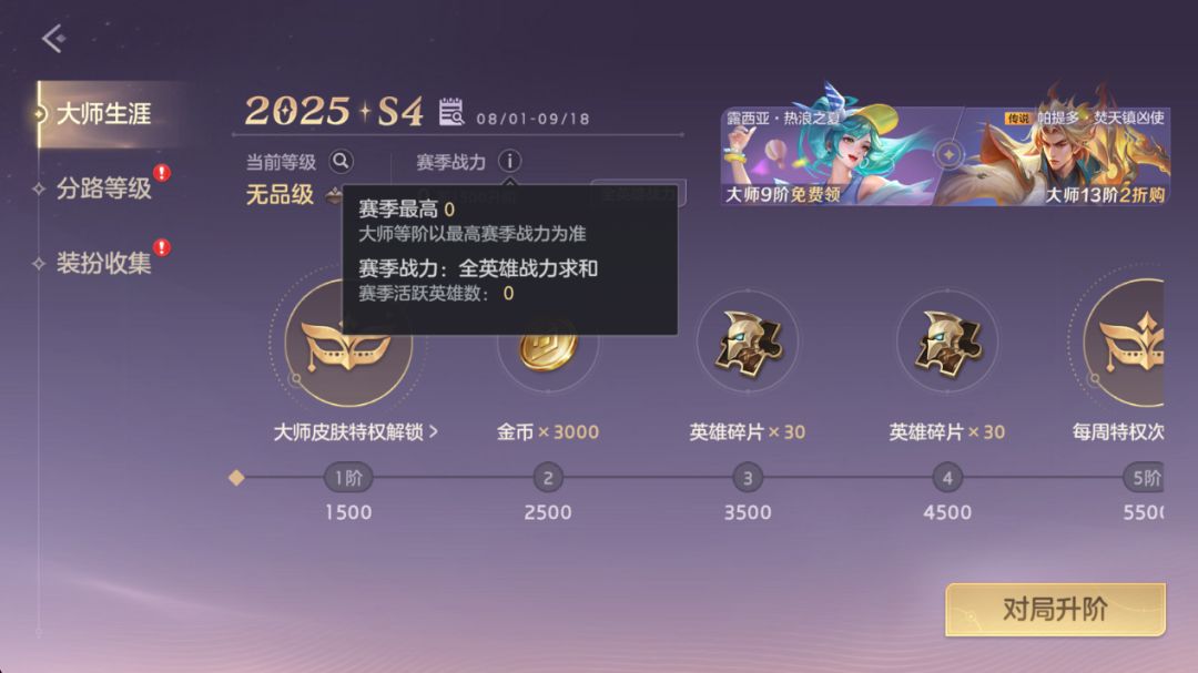由于新赛季战力按比例继承,当前大师等阶未满足局内特效使用等阶时,将无法直接使用特效,需要重新提升大师等阶至规定等阶时才能再次使用。