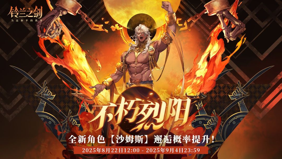 「不朽烈阳」初遇限时邂逅将于 2025/08/22 12:00 - 2025/09/04 23:59 开启,全新传说角色「沙姆斯」邂逅获取概率将大幅提升!