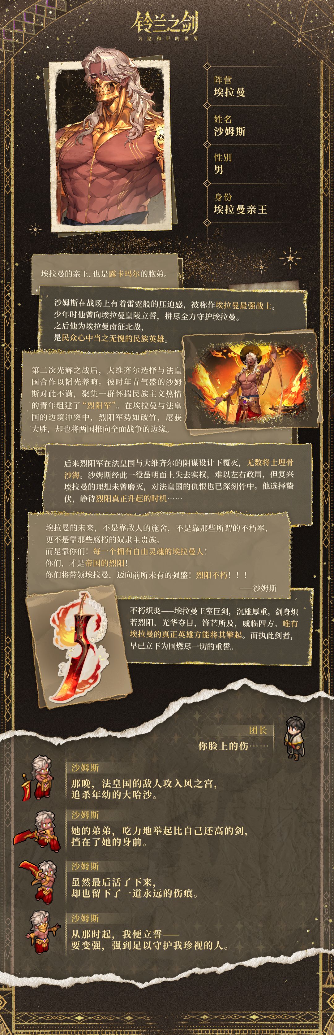 沙姆斯是埃拉曼的亲王,也是露卡玛尔的胞弟。他在战场上有雷霆般的压迫感,被称作埃拉曼最强战士。少年时期的沙姆斯曾向埃拉曼皇陵立誓,拼尽全力守护复兴埃拉曼。之后的他为埃拉曼南征北战,是埃拉曼人心中当之无愧的民族英雄。