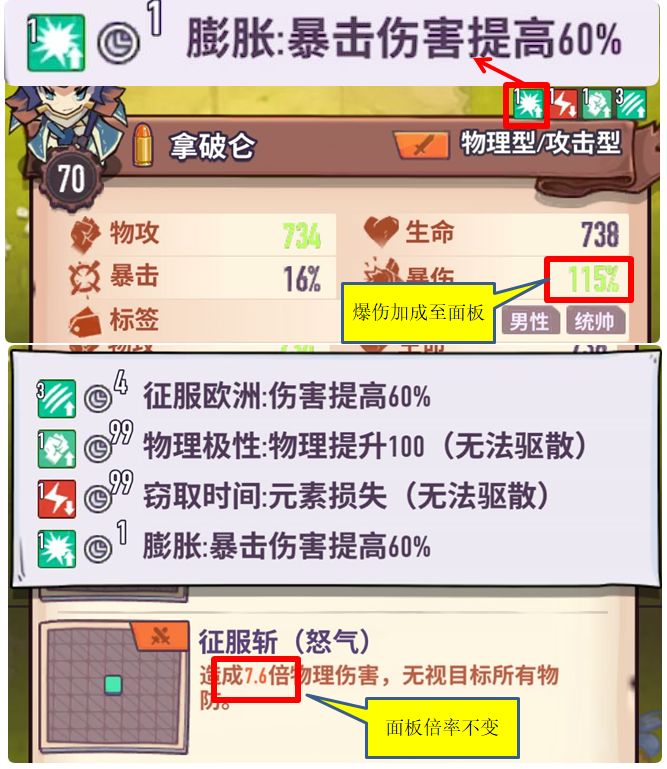 施放大招后,上方骑士获得『膨胀』buff,爆伤增加60%(加成于面板),技能倍率提升(面板不显示但实际有加成)